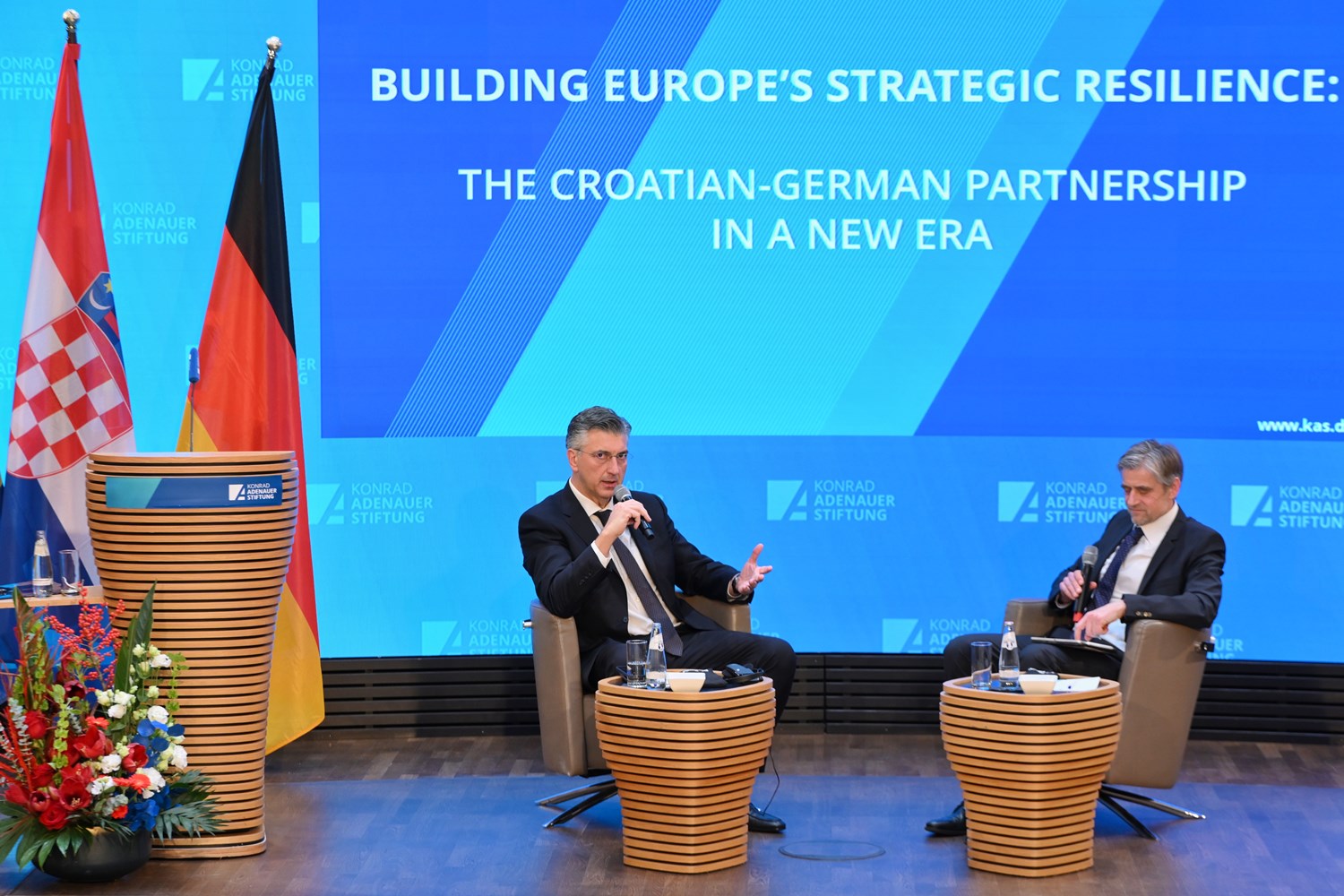 Prime Minister Andrej Plenković arrived in Berlin today for a two-day visit to the Federal Republic of Germany, which began with a lecture at the Konrad Adenauer Foundation on the topic: "Building Europe's Strategic Resilience: Croatian-German Partnership in a New Era", in which he presented the Croatian perspective on the key challenges facing the European Union today, as well as the opportunities that all member states should seize together. He also spoke about the cooperation between Croatia and Germany, from Croatia's independence to the present day, particularly highlighting the importance and contribution of the Croatian community in Germany.