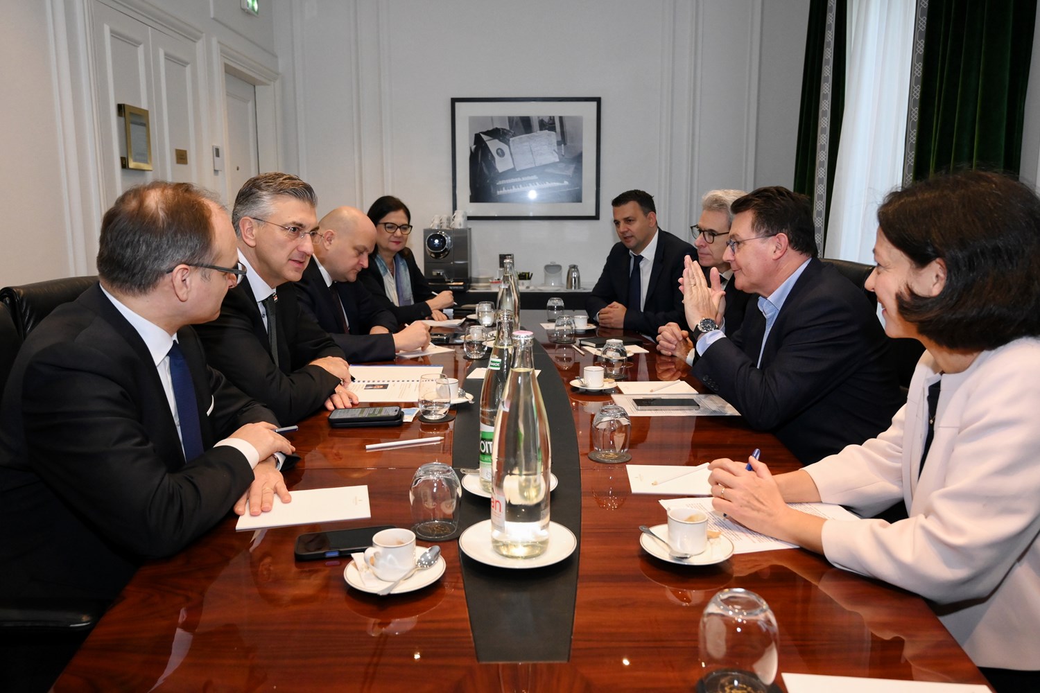 Na sastanku su razgovarali i o pozitivnim gospodarskim trendovima u Hrvatskoj, pri čemu je premijer istaknuo da BDP raste 19 kvartala zaredom, a u okviru Proračuna za 2026. Vlada očekuje zadržavanje proračunskog manjka ispod 3% i smanjenje udjela javnog duga u BDP-u na 56%.