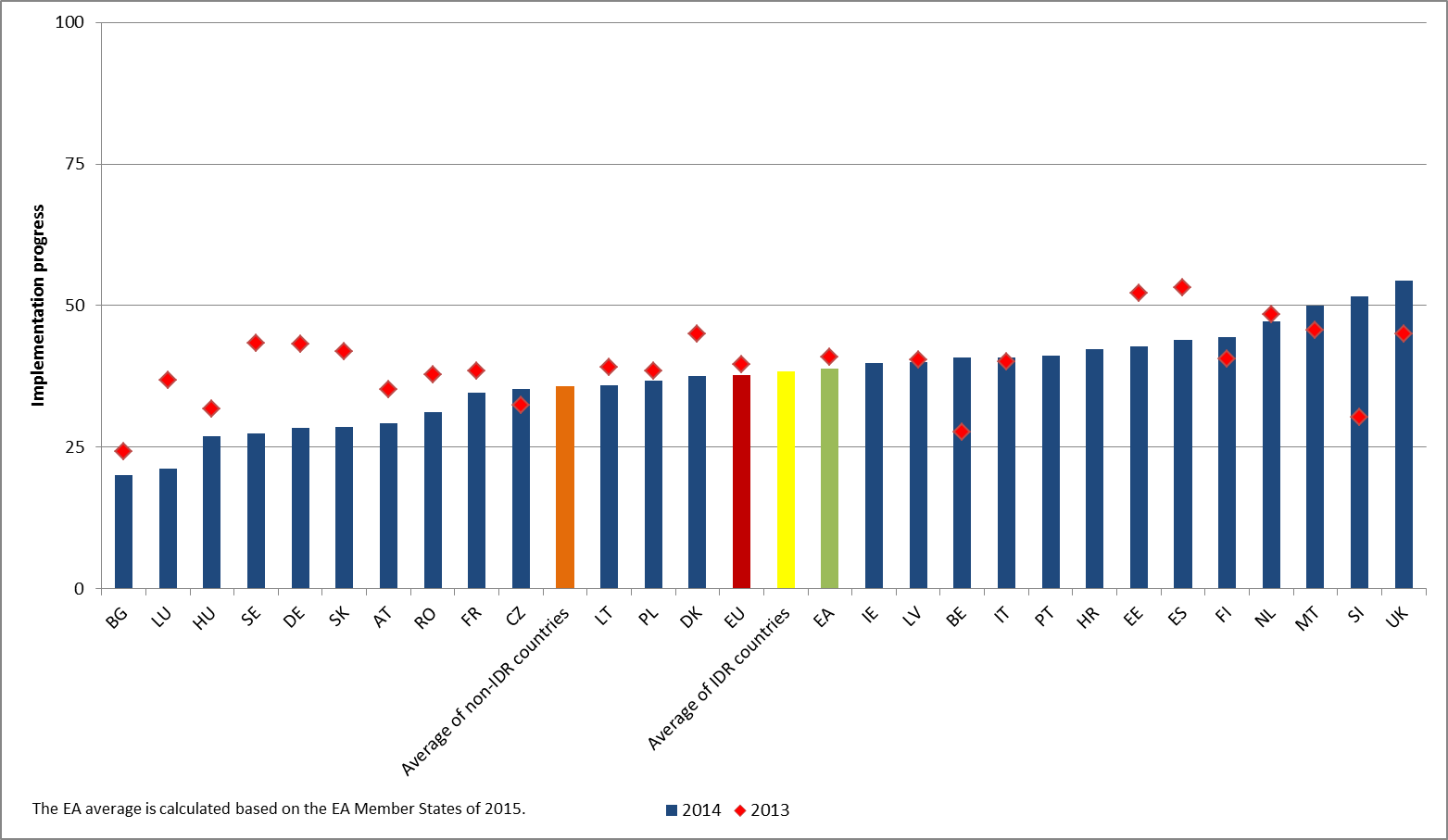 Grafikon 1: Prezentacija EK o napretku u provedbi preporuka na Odboru za ekonomske politike (EPC): Pokazuje da je Hrvatska u odnosu na druge države članice EU, posebno one koje se suočavaju s makroekonomskim neravnotežama („IDR countries“) relativno dobra u provedbi preporuka
