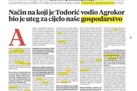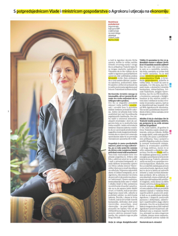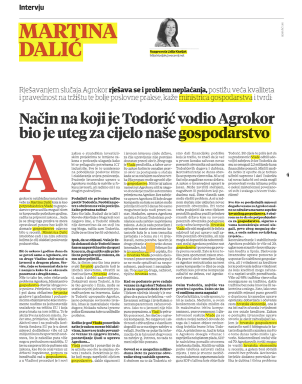 - U tih, kako kažete, 25 godina ja Ivicu Todorića uopće nisam poznavala, osim po viđenju. Koliko se mogu sjetiti, srela sam ga prije ove krize dva puta u protokolarnim prilikama. Teza o potpori u prošlih 25 godina nešto je o čemu ja nemam konkretnih dokaza. Kakvu je eventualno podršku i od koga dobivao, morat će se očito razjasniti u sljedećim mjesecima. Ono što ova Vlada radi i u što ulažemo golem trud, znanje i energiju upravljanje je krizom do koje je doveo g. Todorić, odnosno način na koji je on upravljao svojom kompanijom. Međutim, ono što u svojoj biti cjelokupan proces restrukturiranja Agrokora znači jest to da je to jedna od najvećih reformi u našoj novijoj ekonomskoj povijesti. Mi tu reformu nismo planirali, nismo očekivali, ali kada smo zbivanjima bili prisiljeni reagirati, onda danas na djelu imamo reformu dobrog dijela poslovnih odnosa u Hrvatskoj. Jer svi smo zajedno tijekom proteklih mjeseci saznali o velikom broju neprihvatljivih poslovnih praksi koji su se prakticirale između Agrokora i njegovih poslovnih partnera i dobavljača, uključujući i neprihvatljivo duge rokove plaćanja. Ono što se ja pitam jest kako je moguće da su čak i najveći Agrokorovi poslovni partneri, uključujući one u stranom vlasništvu, pristajali na takve dogovore i nikada, prema mom saznanju, nisu poduzeli pravne radnje da se od takve prakse zaštite. A takva je poslovna praksa bila velik uteg sposobnosti rasta hrvatske ekonomije i njezinoj efikasnosti. Izvanredna uprava dovela je u red rokove plaćanja i poslovnu praksu. Upravo zato cijeli proces vidim kao način razrješavanja, ne samo problema neplaćanja već i povećanja kvalitete i pravednosti tržišnih odnosa i poslovne prakse u Hrvatskoj.