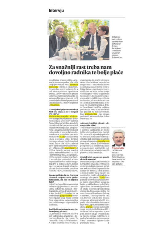 - Vlada ponavlja i ponavljat će da je učinila ono što je njezina obveza i zadaća. Detektirala je rizike koji mogu zaprijetiti cijelom gospodarstvu, dakle sigurnosti i javnom interesu cijele države, za čije upravljanje nije postojao dostatan pravni okvir. Zbog toga je Vlada predložila, a Sabor usvojio zakon kojim je osnažen pravni okvir za postupanje u slučaju kada se sa stečajem suočava tvrtka čija propast može ugroziti cijelo gospodarstvo. Niti je taj zakon nametnut Agrokoru niti je njegovo donošenje značilo automatsku primjenu na Agrokor. Bez zahtjeva uprave Agrokora ili koje druge kompanije na koju se zakon može primijeniti on bi i danas bio samo mogućnost koju nudi pravni sustav. Međutim, uprava Agrokora na čelu s Ivicom Todorićem podnijela je sudu zahtjev za primjenu zakona. A da ja sada ponavljam i opisujem stanje ekonomske katastrofe koja je u tom trenutku zavladala i o čemu ste i vi izvještavali, nema potrebe. Sasvim je drugo pitanje ako je netko danas iznenađen, šokiran ili bijesan što je izvanredna uprava uspjela, što je hrvatska Vlada povukla djelotvoran i pravovremen potez pa je se ne može optuživati za nesposobnost, pasivnost i nesnalaženje. To je sasvim druga, nažalost, tipično hrvatska tema.