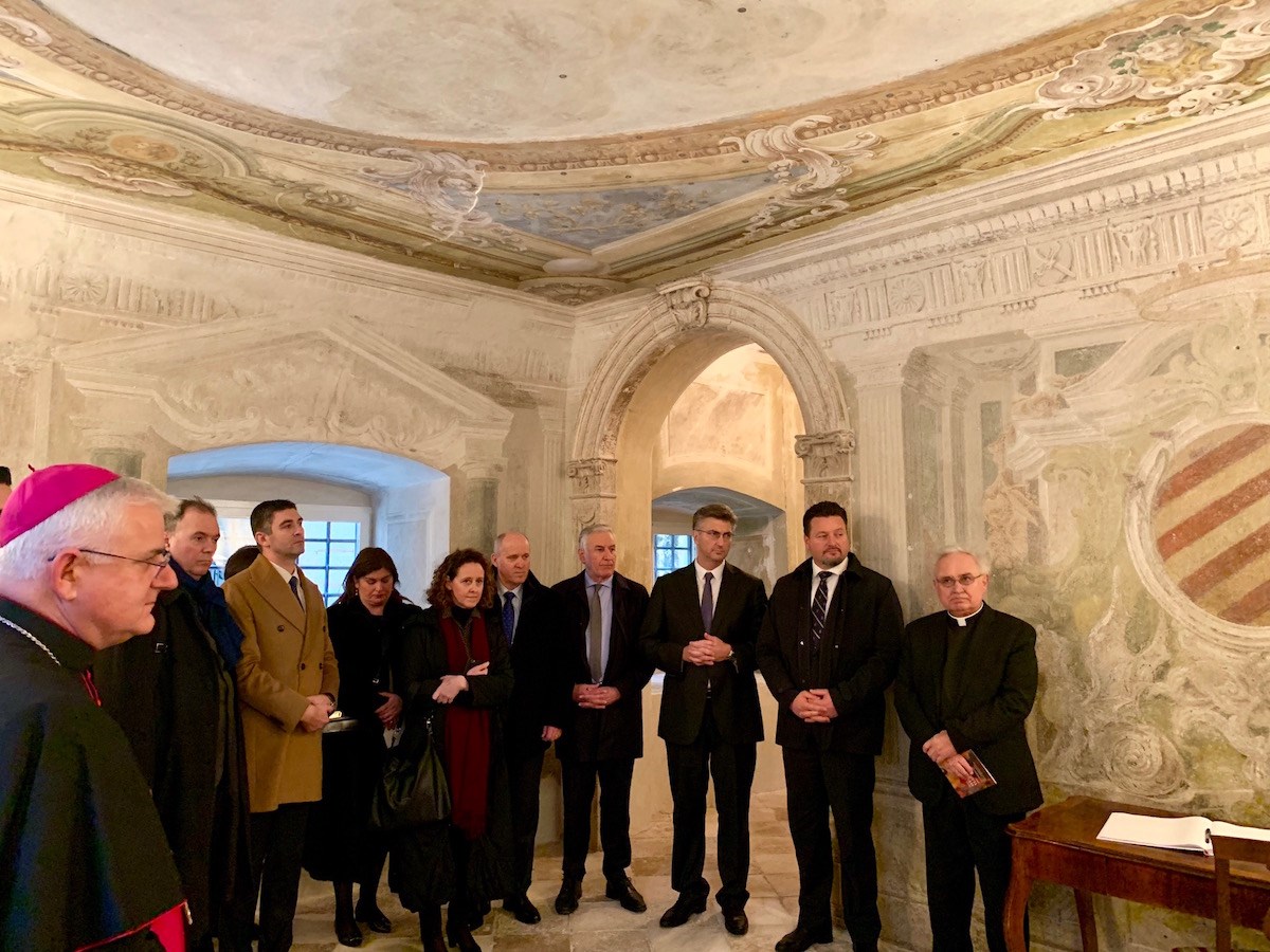 Nakon svečane sjednice Gradskog vijeća, predsjednik Vlade Plenković susreo se s dubrovačkim biskupom, msgr. Matom Uzinićem te obišao obnovljenu Biskupsku palaču.