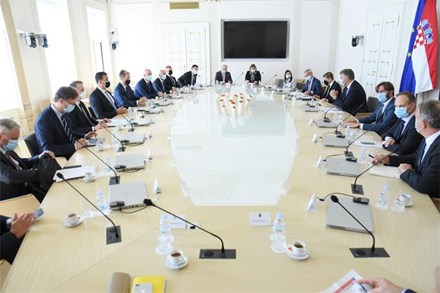 Uz predsjednika Vlade bili su potpredsjednik Vlade i ministar financija Zdravko Marić i ministar gospodarstva i održivog razvoja Tomislav Ćorić, a na sastanku je sudjelovao i guverner Hrvatske narodne banke Boris Vujčić.