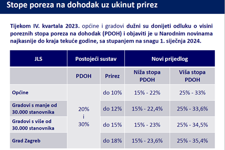 U novom prijedlogu, pojasnio je, omogućuje se sljedeće: primjerice, općina koja danas ima 10 posto prireza na porez na dohodak od 20 posto, može imati maksimalnu stopu novog poreza na dohodak, u kojem je kumuliran i porez na dohodak i prirez, od 22 posto.