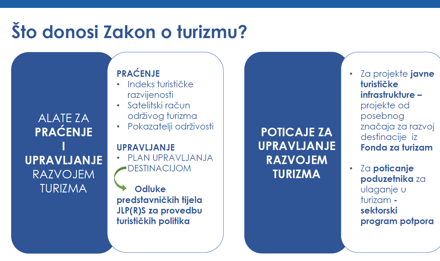 Predstavnička tijela će moći na temelju smjernica i preporuka iz plana upravljanja destinacijom između ostalog donositi odluke o popisu projekata od posebnog značaja za razvoj destinacije, o broju, vrsti i kategoriji ugostiteljskih objekata te objekata u kojima se pružaju ugostiteljske usluge smještaja, zatim kapacitetima smještajnih objekata u destinaciji, kao i uvođenju turističkog ekološkog doprinosa za goste koji borave u destinaciji, od kojeg bi se prihodi mogli trošiti isključivo namjenski, primjerice za poboljšanje komunalne infrastrukture, navedeno je.