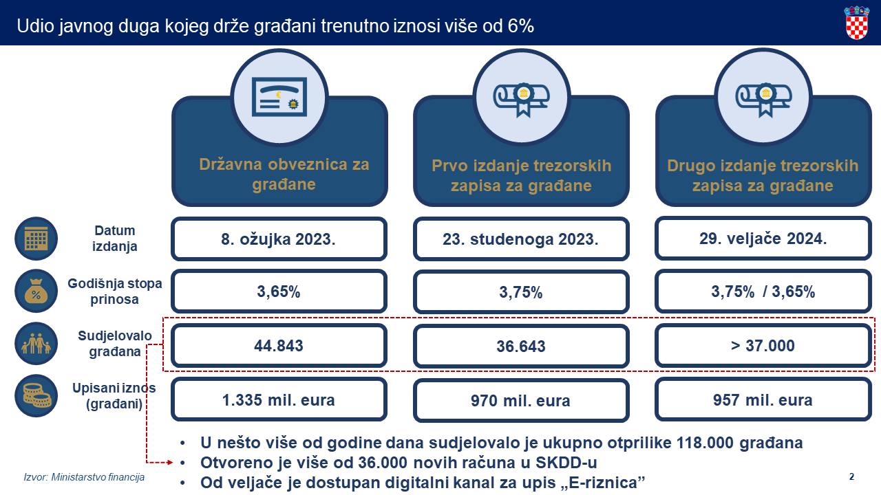 U dosadašnja dva izdanja narodnih trezoraca i jednom narodnih obveznica sudjelovalo je ukupno oko 118 tisuća građana, a kako je istaknuo Primorac, ukupno je upisano oko 3,3 milijarde eura, čime se oko šest posto ukupnog javnog duga nalazi u rukama hrvatskih građana.