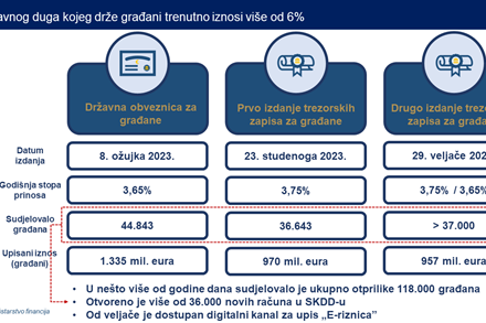 U nešto više od godinu dana ovo će tako biti već četvrto izdanje vrijednosnih papira države koje će moći kupiti građani, od toga treće trezorskih zapisa, koje su građani mogli upisati i lanjskog studenog i u veljači ove godine, pri čemu je samo u tom najrecentnijem izdanju više od 37 tisuća građana za trezorce uplatilo 957 milijuna eura.