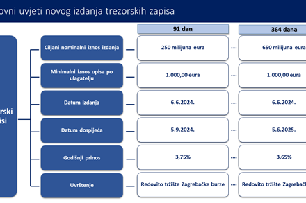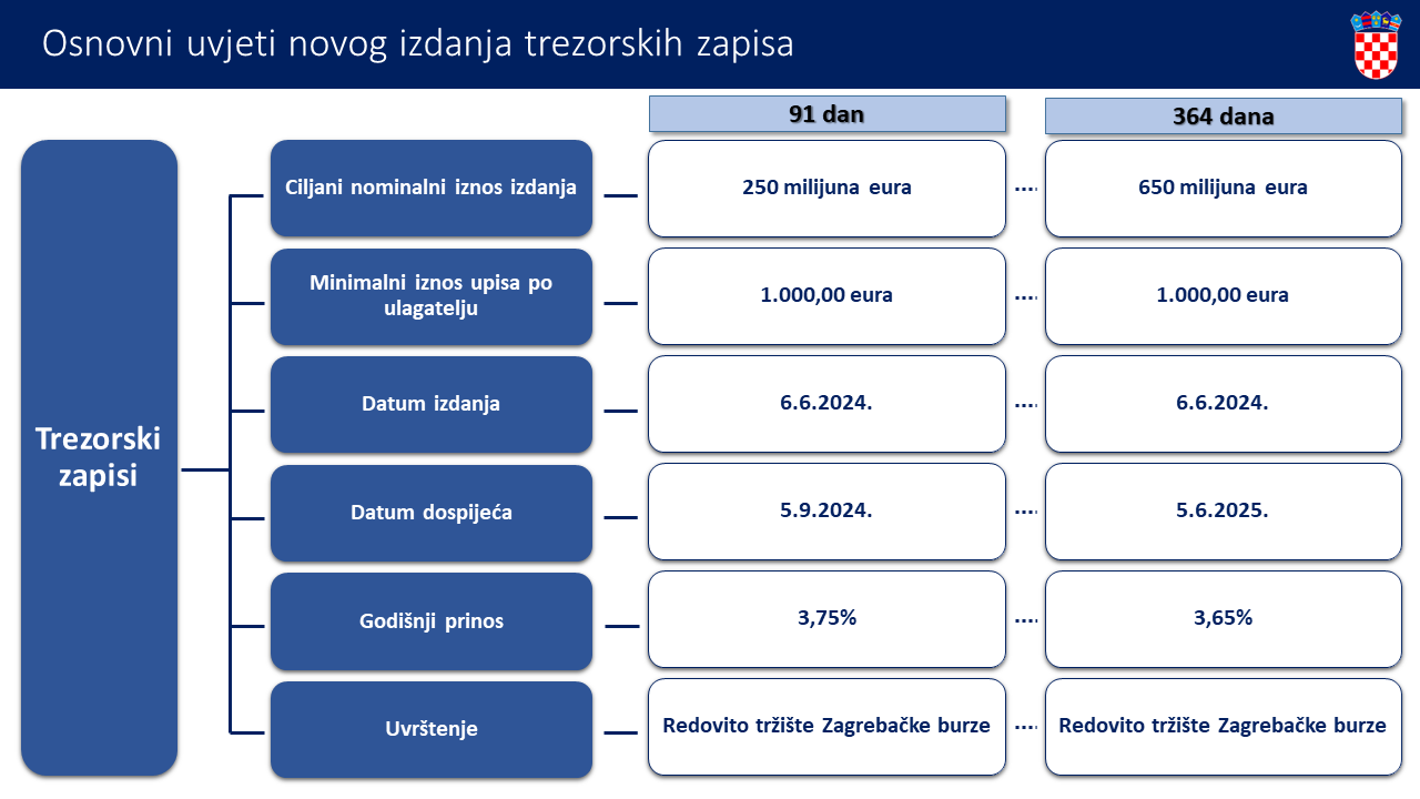 Novi krug upisa trezorskih zapisa za građane započinje od ponedjeljka, 27. svibnja, ciljani nominalni iznos je ukupno 900 milijuna eura, a moći će se ulagati u trezorce ročnosti od 91 dana, čime se planira prikupiti 250 milijuna eura, te od 364 dana, uz ciljani iznos od 650 milijuna eura.