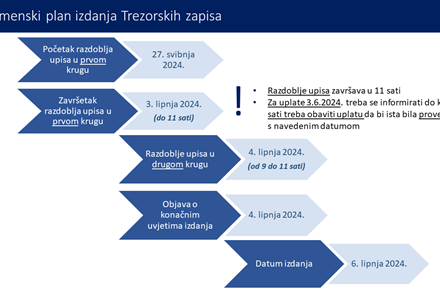 Rok upisa trezorskih zapisa u prvom krugu je 3. lipnja do 11 sati, dok će idućeg dana od 9 do 11 sati "trezorce" u drugom krugu moći upisati i institucionalni ulagači.