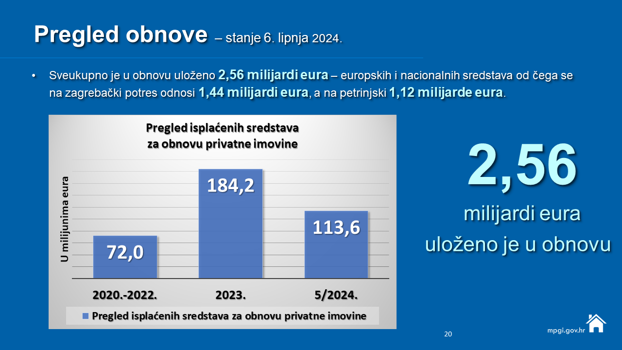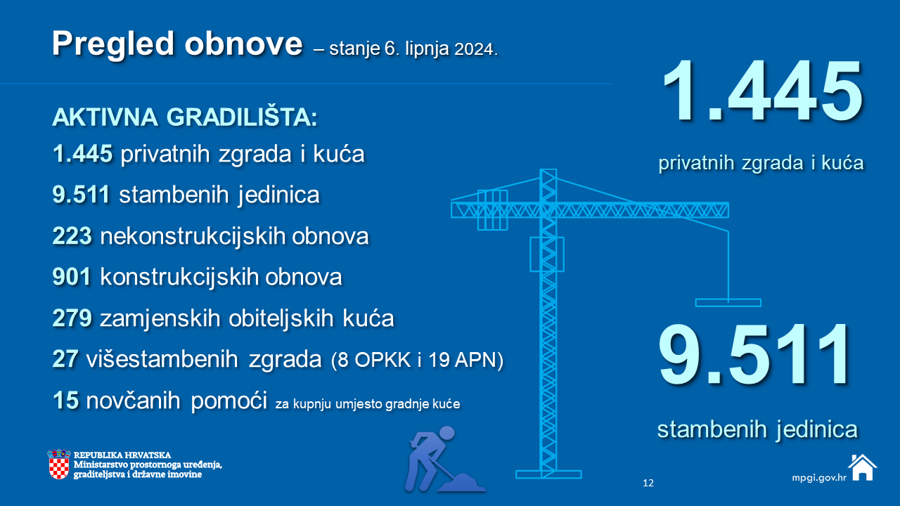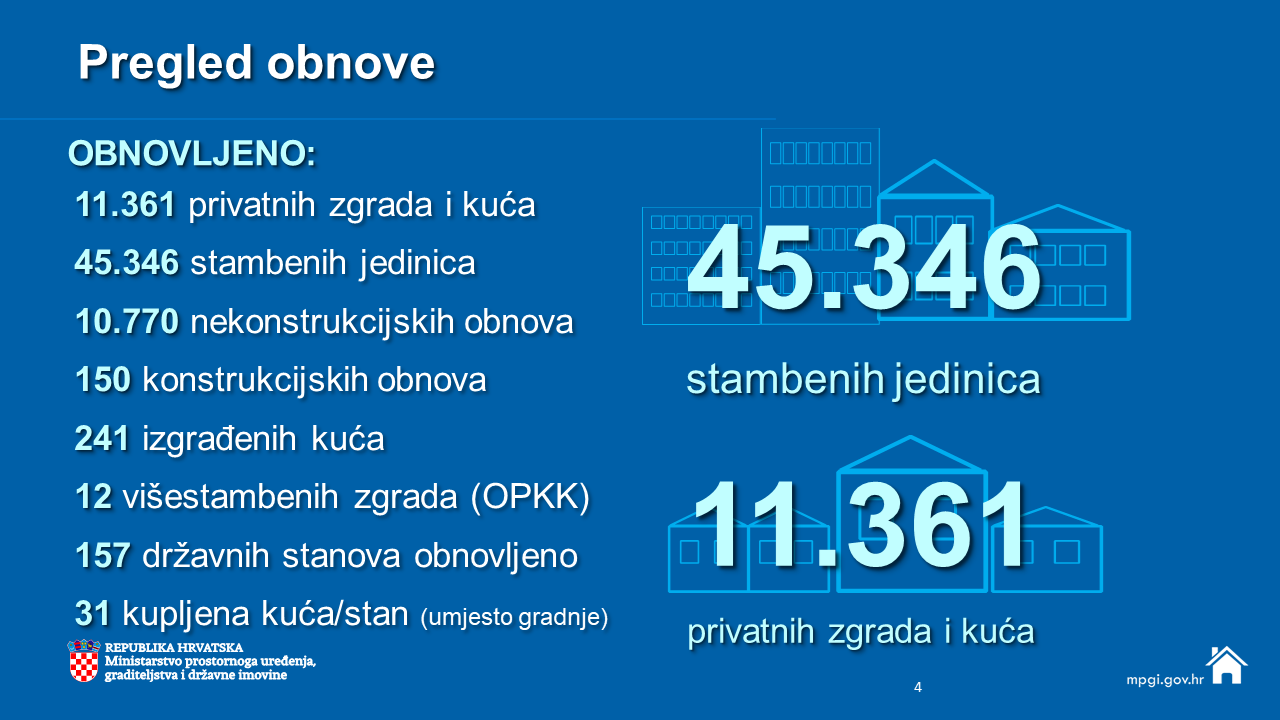 S današnjim danom obnova je u potpunosti završila na 11.985 lokacija od čega 11.361 privatnih zgrada i kuća s ukupno 45.346 stambenih jedinica. Završena su i 624 projekata financirana iz Fonda solidarnosti EU.