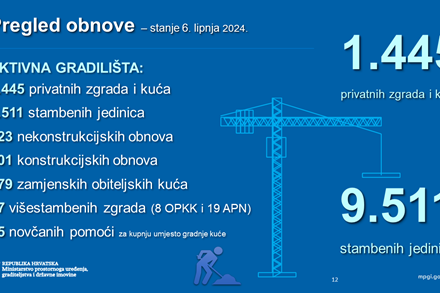 Dodao je da je trenutno u obnovi ogroman broj gradilišta, čak 1.732 i to za 1.445 privatnih zgrada i kuća te 287 zgrada javne namjene infrastrukture.