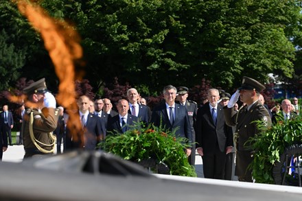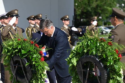Prime Minister Andrej Plenković and members of the Government are participating today in the celebration of Statehood Day, which began with the laying of wreaths at the Homeland Monument.