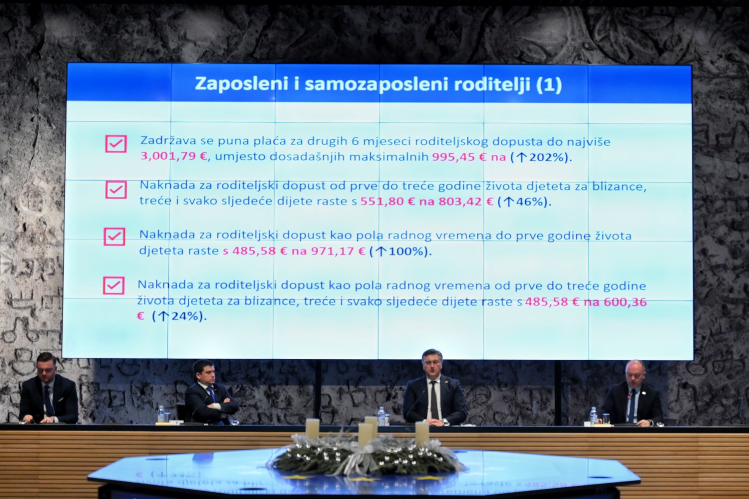 Podsjetio je da se udvostručuje jednokratna naknada za svako rođeno dijete s 309 na 618 eura, a udvostručuje se i broj dana za plaćeni očinski dopust. Izdvojio je povećanje naknade za drugih šest mjeseci roditeljskog dopusta od 1. ožujka iduće godine, koje će iznositi do 3000 eura umjesto dosadašnjih 995, što će, kako je rekao, pokriti oko 98 posto svih majki koje mogu imati toliku plaću.